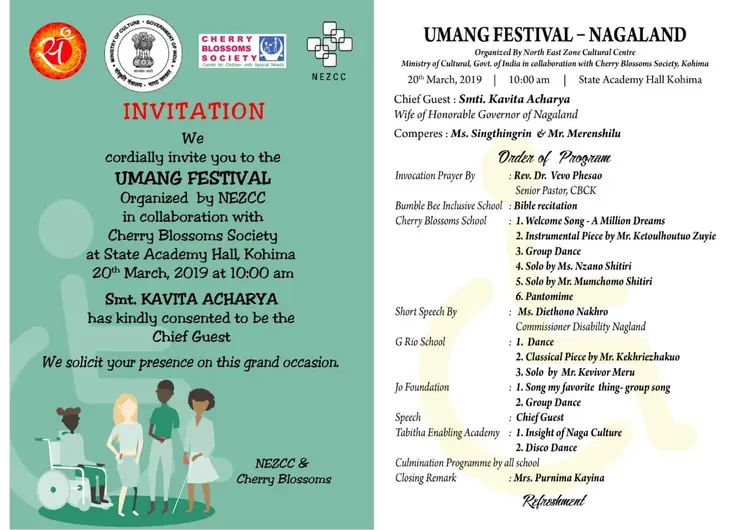 Yes! UMANG FESTIVAL is here!.....We cordially invite you to the UMANG FESTIVAL Organized by NEZCC in collaboration with Cherry Blossoms Society at State Academy Hall, Kohima on 20th March 2019 at 10:00am